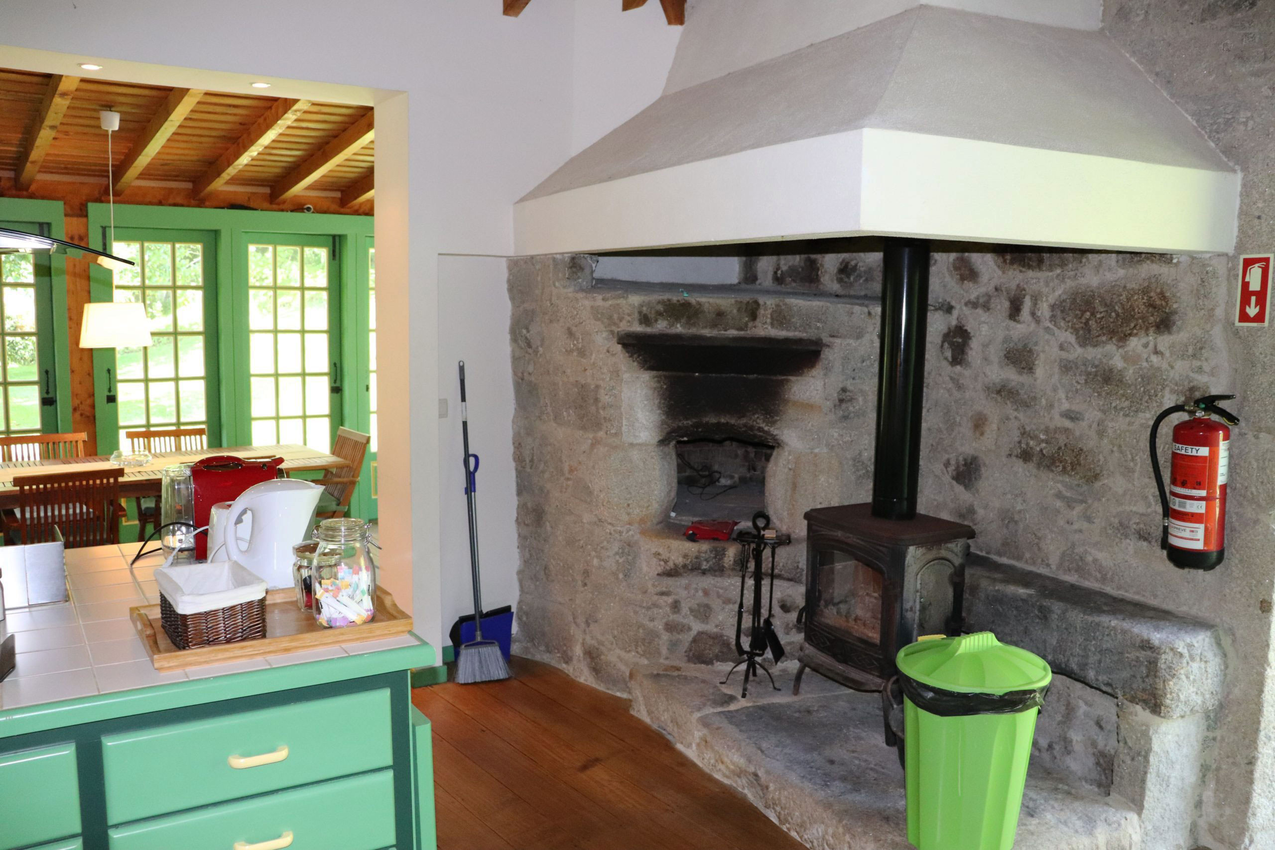 Entrando pela porta da cozinha encontramo-nos num espaço moderno com a antiga lareira e forno de pão logo à entrada e um espaço central com ampla bancada, com fogão e forno elétricos embutidos, uma máquina de café de cápsulas, uma chaleira elétrica e uma torradeira, com múltiplas gavetas com todos os utensílios de cozinha. Noutro espaço, a banca, a máquina de lavar louça, o frigorífico com congelador e o micro-ondas.