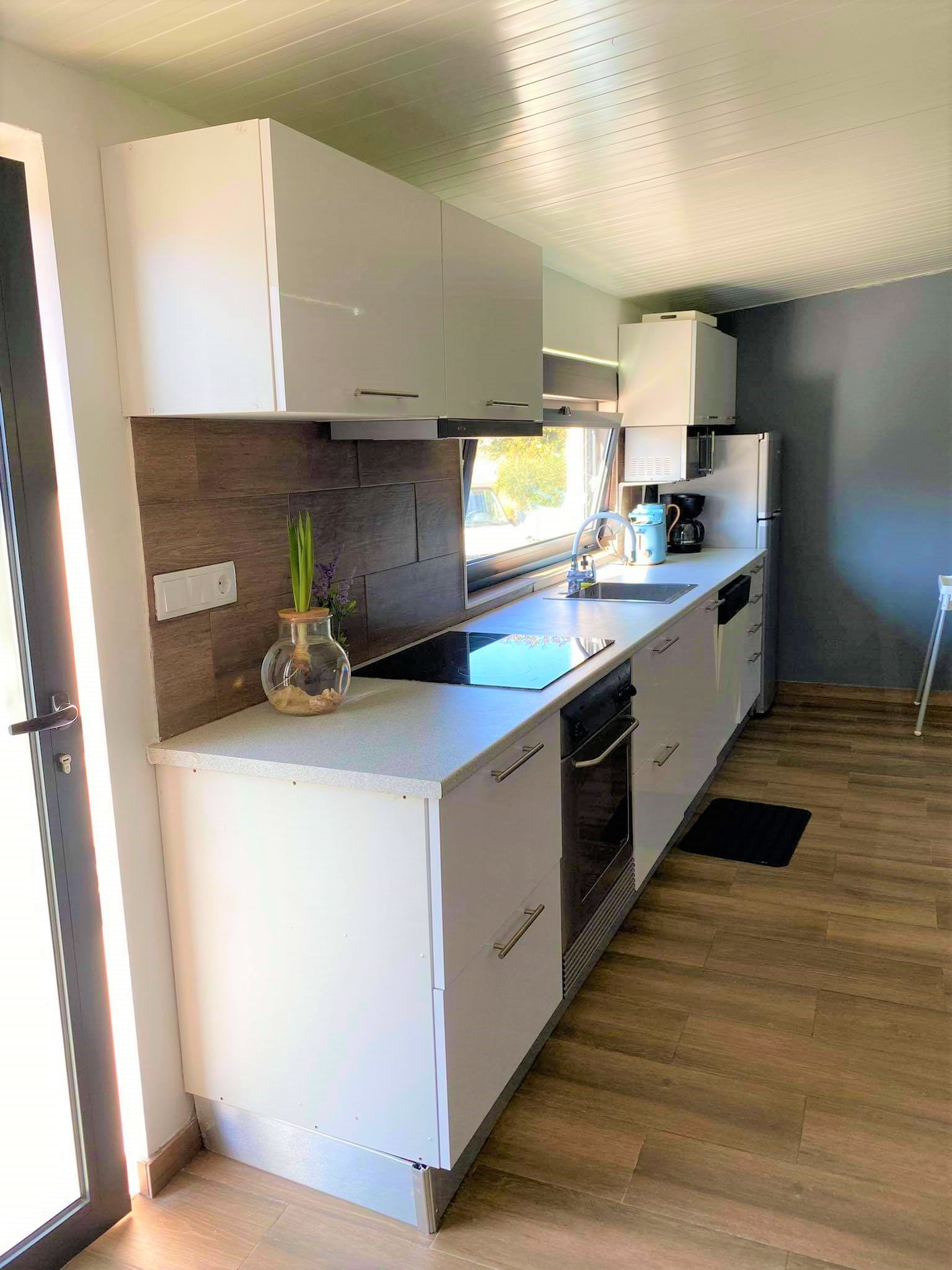 In the hotplate of glass ceramics open plan kitchen, refrigerator, microwave, oven, freezer, dishwasher, dishes/cutlery and kitchen utensils are provided.