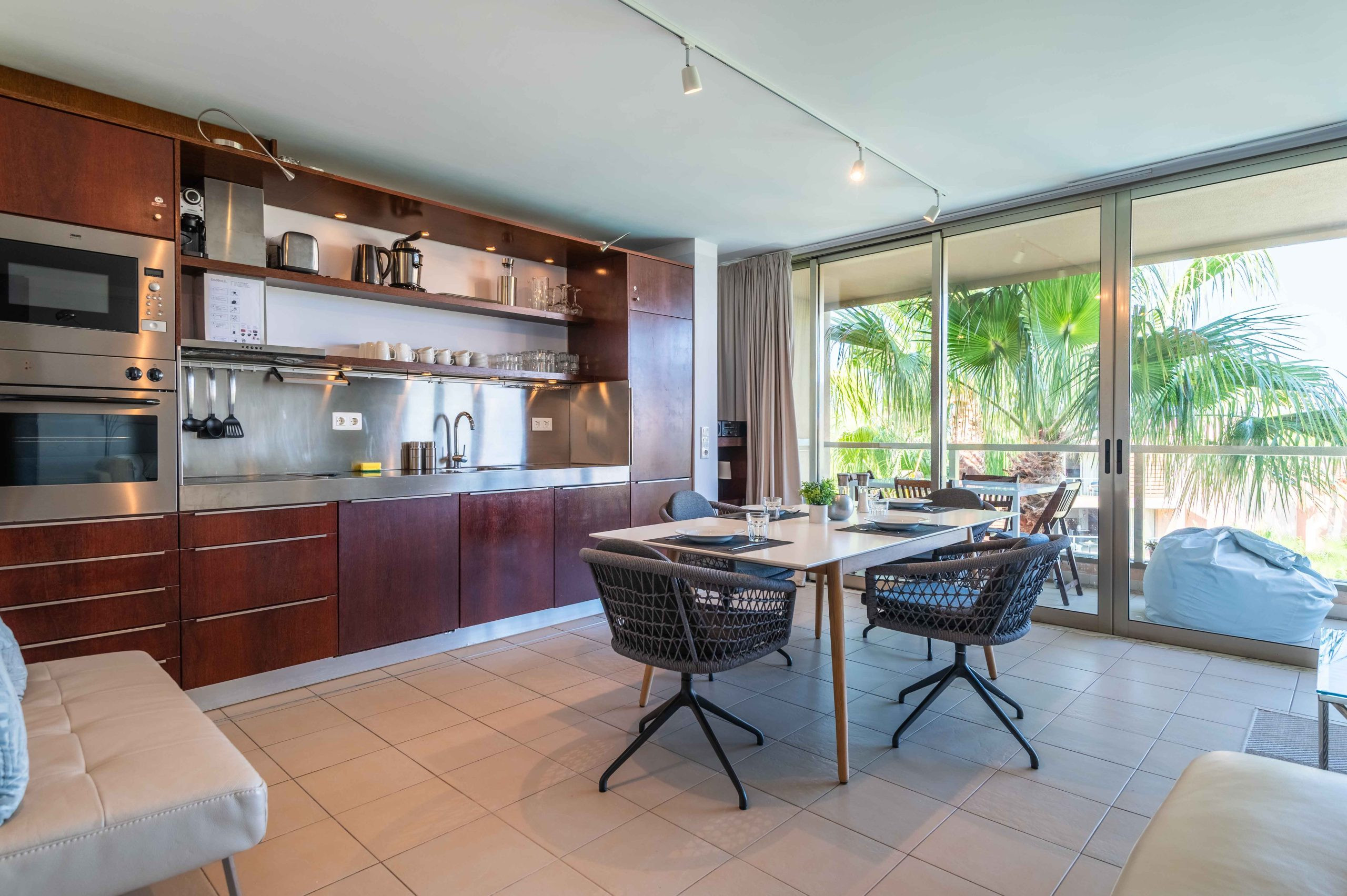 Elle dispose de jardin, mobilier de jardin, lave-linge, accès internet (wifi), balcon, climatisation dans le salon et certaines chambres, piscine collective, parking extérieur même bâtiment, tv satellite.